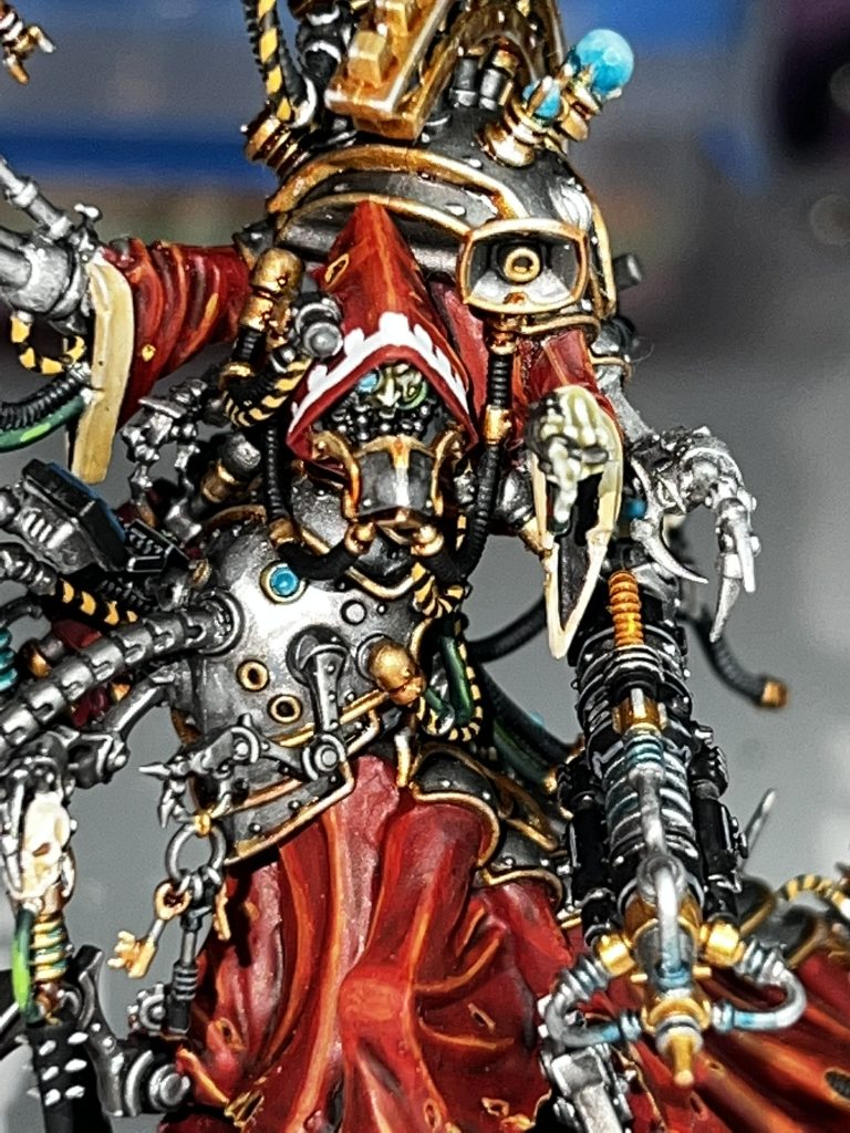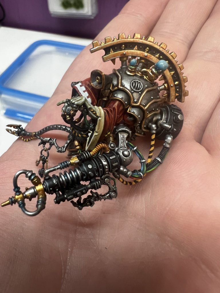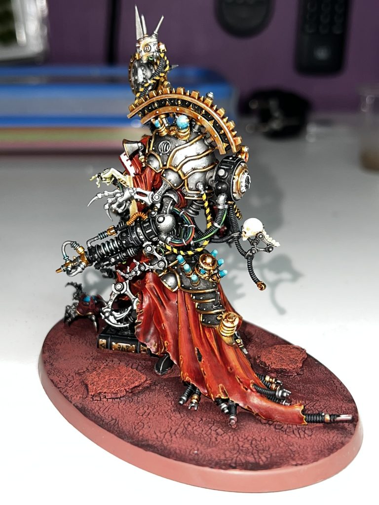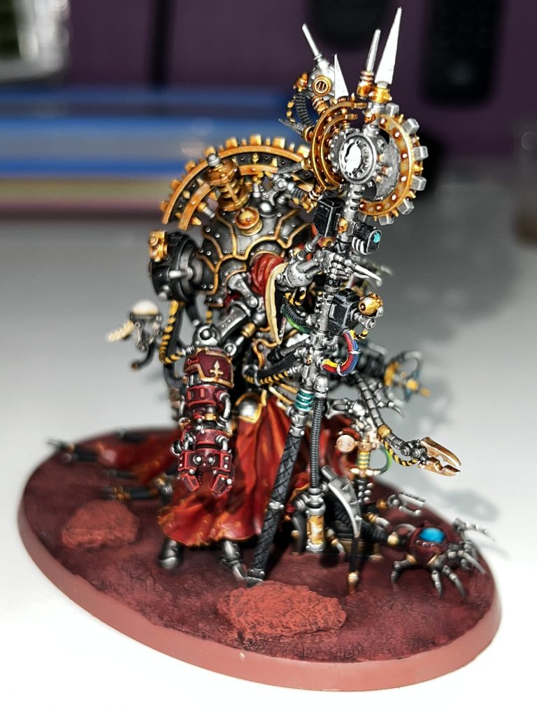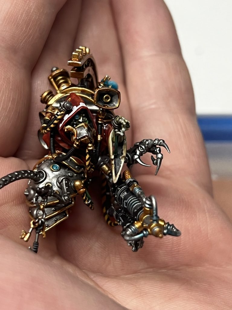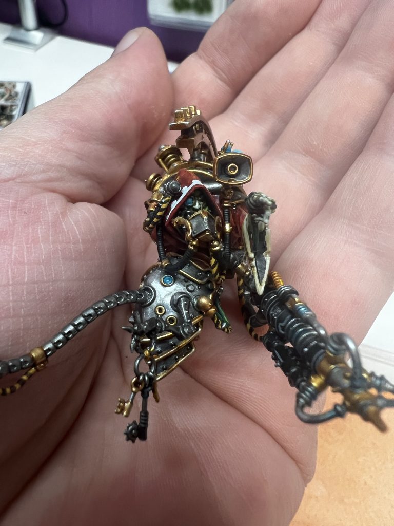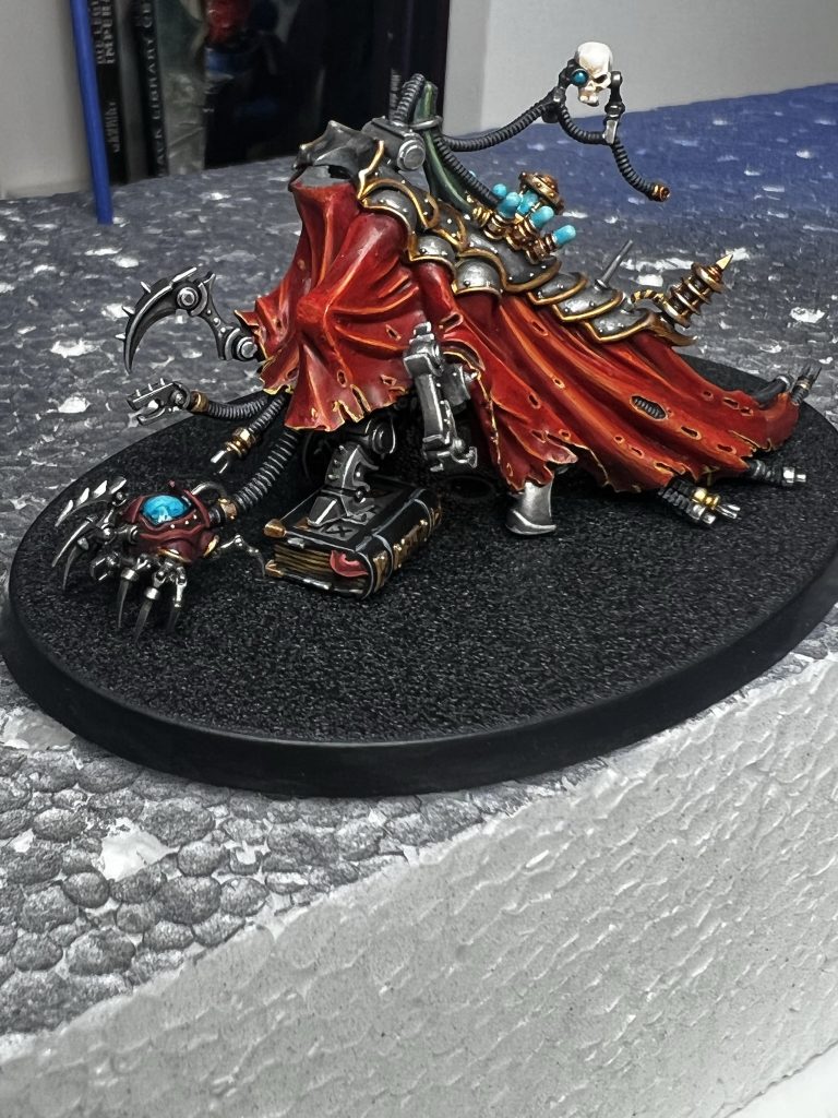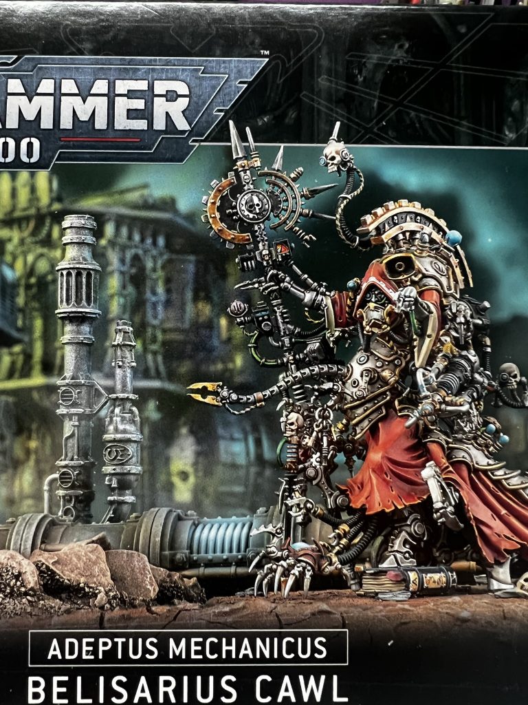 Mehr Maschiene als Mensch, Belisarius Cawl schreitet mit überragender Größe über das Schlachtfeld. Getragen wird sein Körper von vielen kleinen, an Insektenbeine erinnernden Stelzen. Über Zehntausend Jahre alt, Archmagos Dominus, Fabriklord, Lexico Arcanus und anerkannter Magos Biologis. Ein sehr schönes Modell das nicht einfach zu bemalen ist.