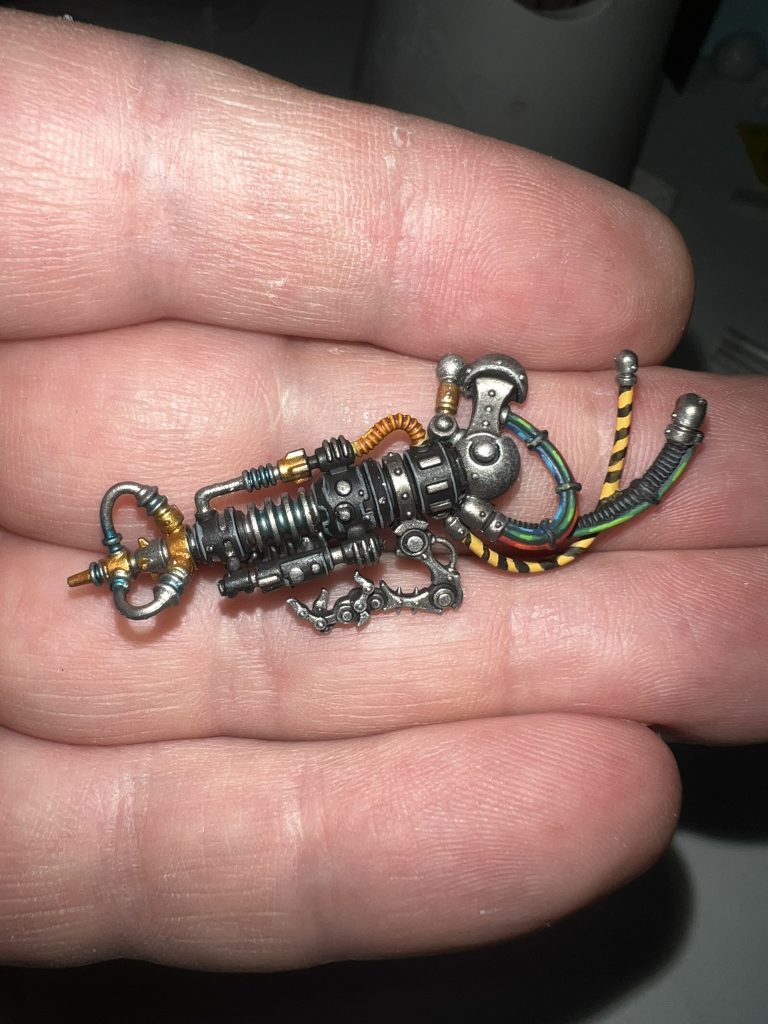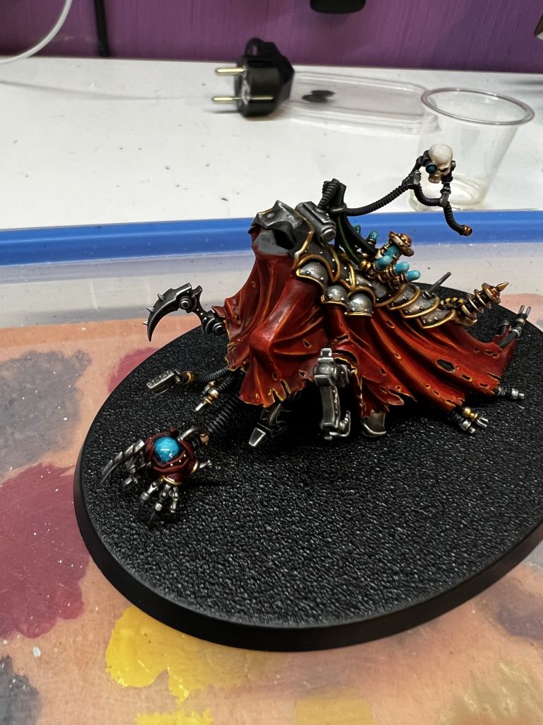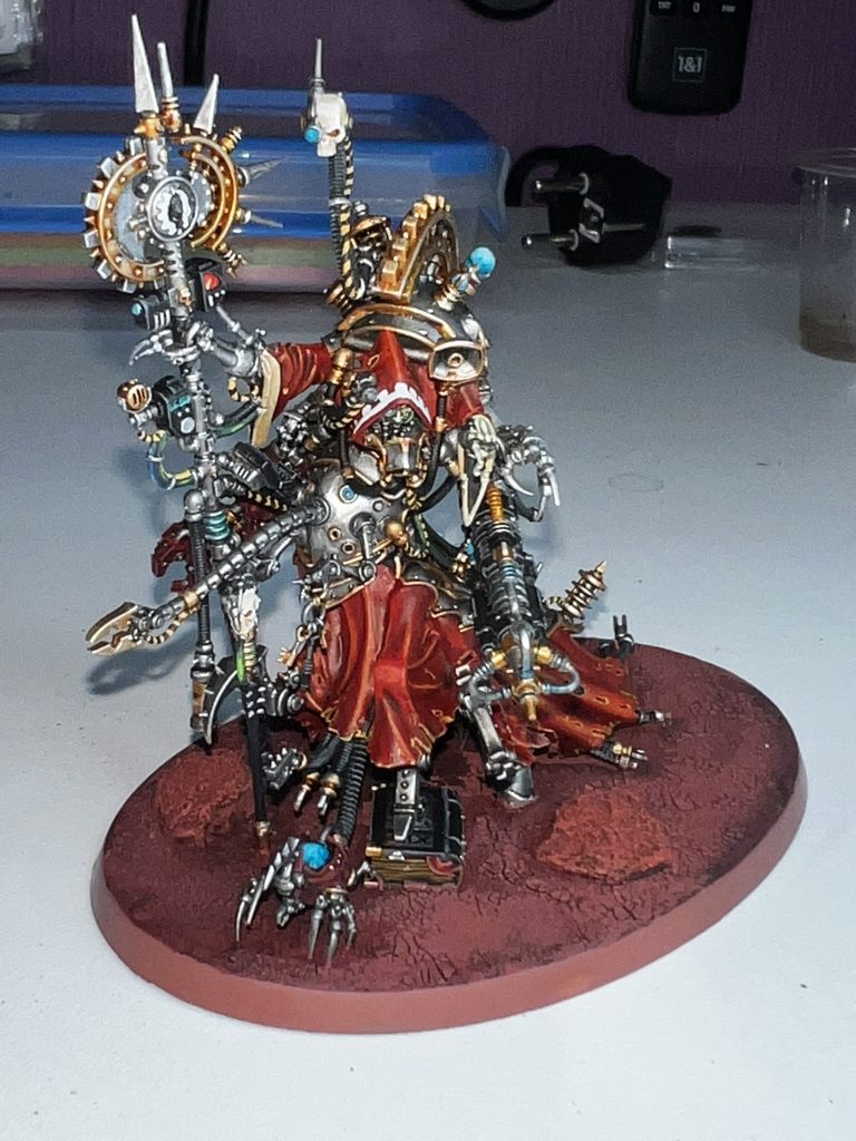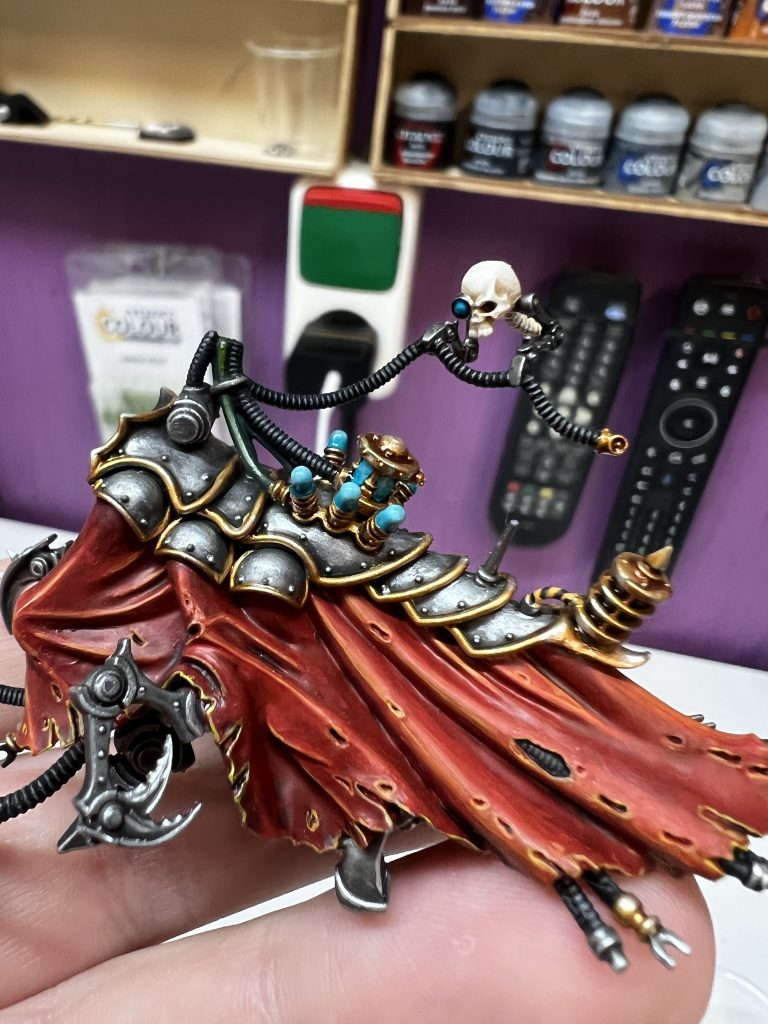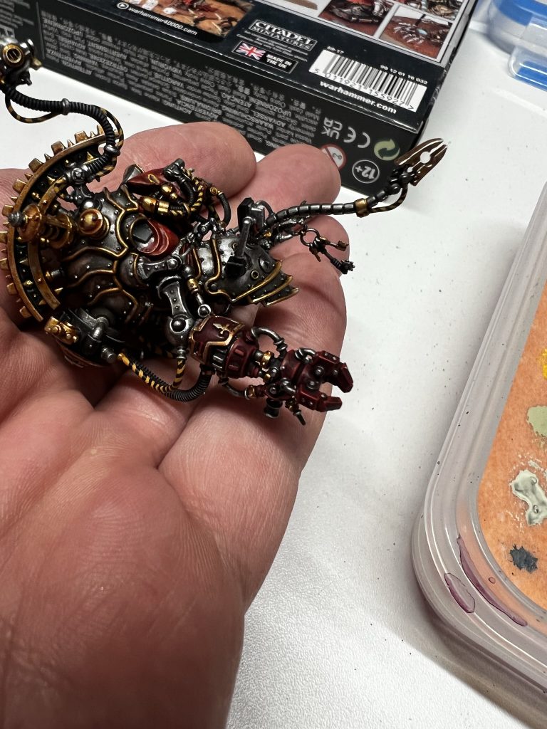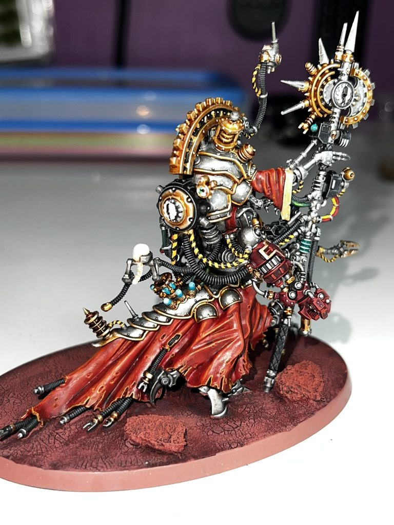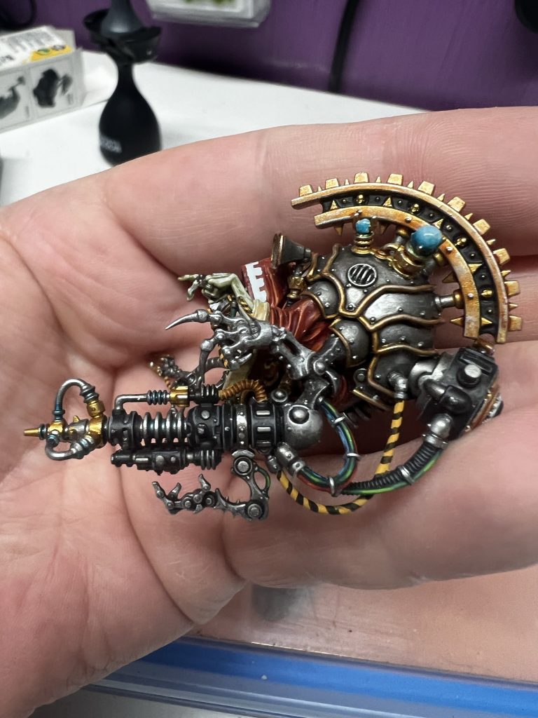 Mehr Maschiene als Mensch, Belisarius Cawl schreitet mit überragender Größe über das Schlachtfeld. Getragen wird sein Körper von vielen kleinen, an Insektenbeine erinnernden Stelzen. Über Zehntausend Jahre alt, Archmagos Dominus, Fabriklord, Lexico Arcanus und anerkannter Magos Biologis. Ein sehr schönes Modell das nicht einfach zu bemalen ist.