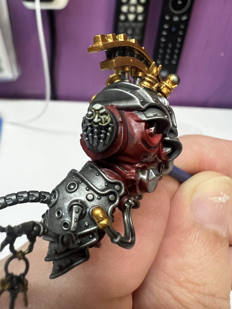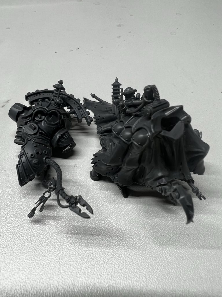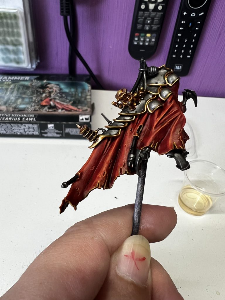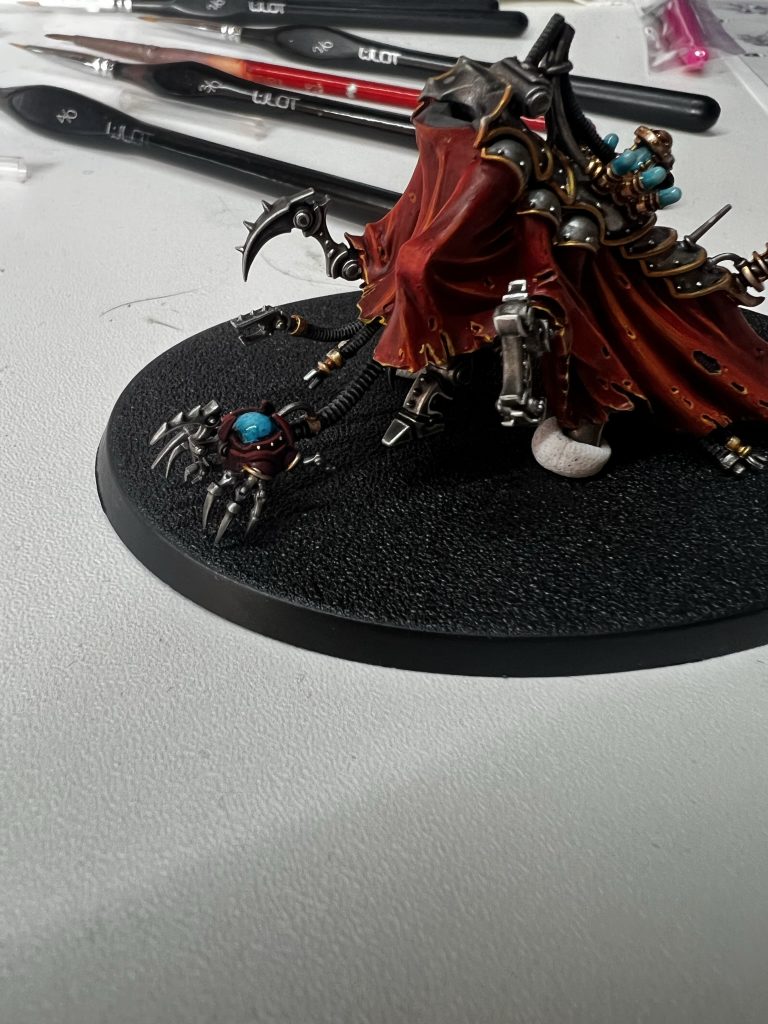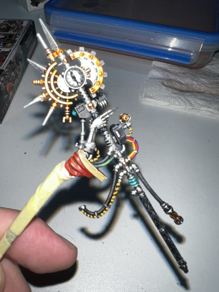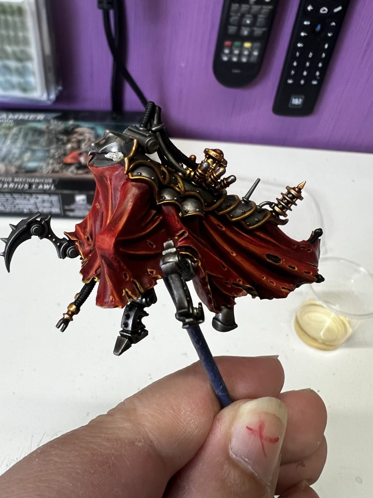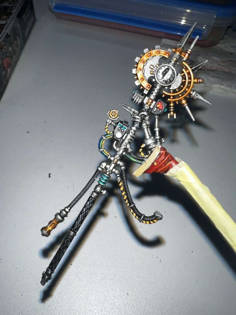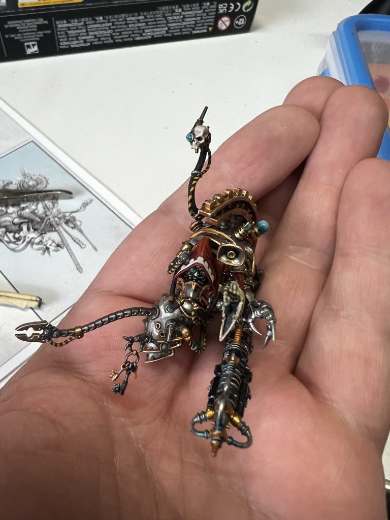 Mehr Maschiene als Mensch, Belisarius Cawl schreitet mit überragender Größe über das Schlachtfeld. Getragen wird sein Körper von vielen kleinen, an Insektenbeine erinnernden Stelzen. Über Zehntausend Jahre alt, Archmagos Dominus, Fabriklord, Lexico Arcanus und anerkannter Magos Biologis. Ein sehr schönes Modell das nicht einfach zu bemalen ist.